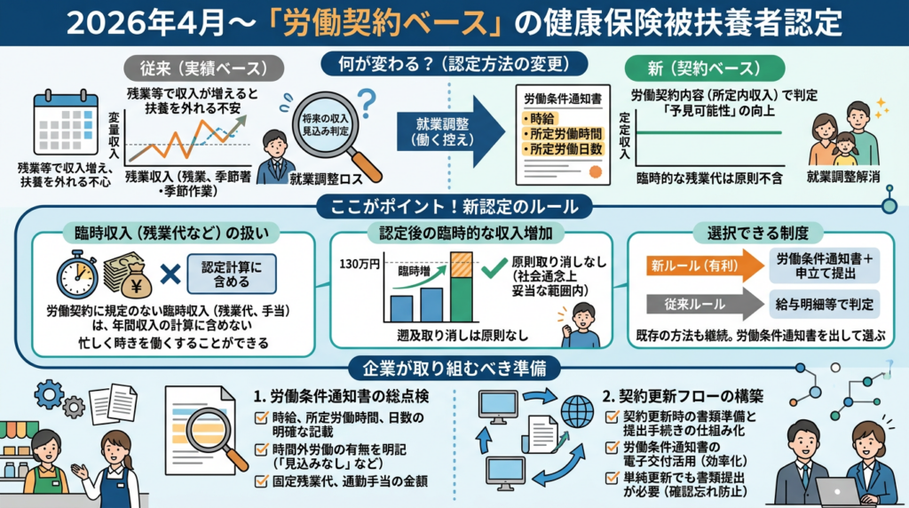 この問題に対応する形で、2026年4月から健康保険の被扶養者認定のルールが変わります。金額そのものは変わりません。しかし、何を基準に130万円かどうかを判断するかが、大きく変わります。今回のコラムでは、制度の背景から実務対応まで、経営者・人事担当者が知っておくべきことを徹底解説します。