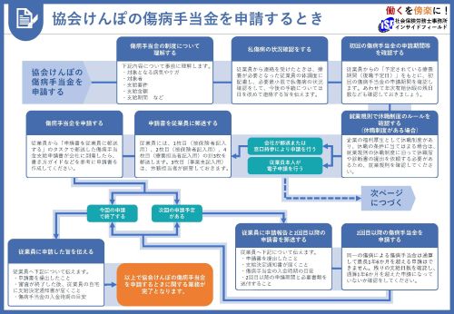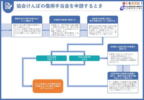 協会けんぽの傷病手当金を申請する場合の一般的な業務をフロー図にしています。作業漏れがないように、また新任担当者のマニュアルとしてご活用ください。