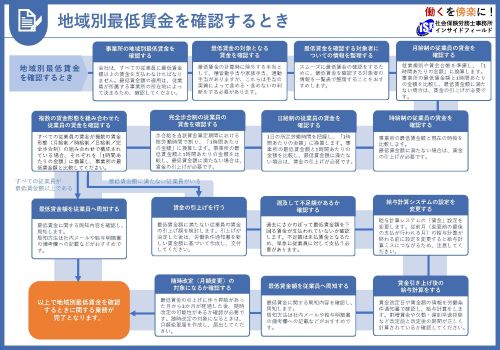 地域別最低賃金を確認する場合の一般的な業務をフロー図にしています。作業漏れがないように、また新任担当者のマニュアルとしてご活用ください。